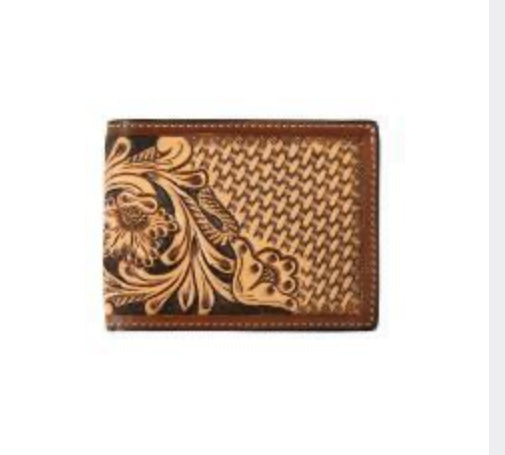 Decorative and stylish mens 3D bifold wallet. It has a genuine tan body that is hand tooled with a floral, basket weave and checkers design. Multiple card slots, a cash slot and a flip case with an ID window.