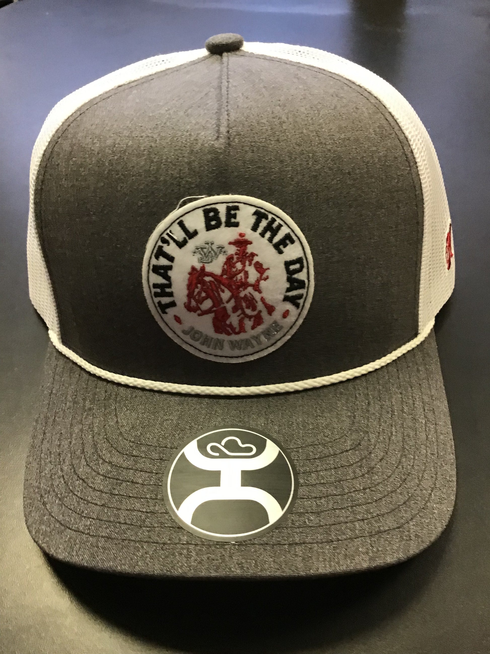 John Wayne grey, white 5-panel trucker with red, white circle patch hat