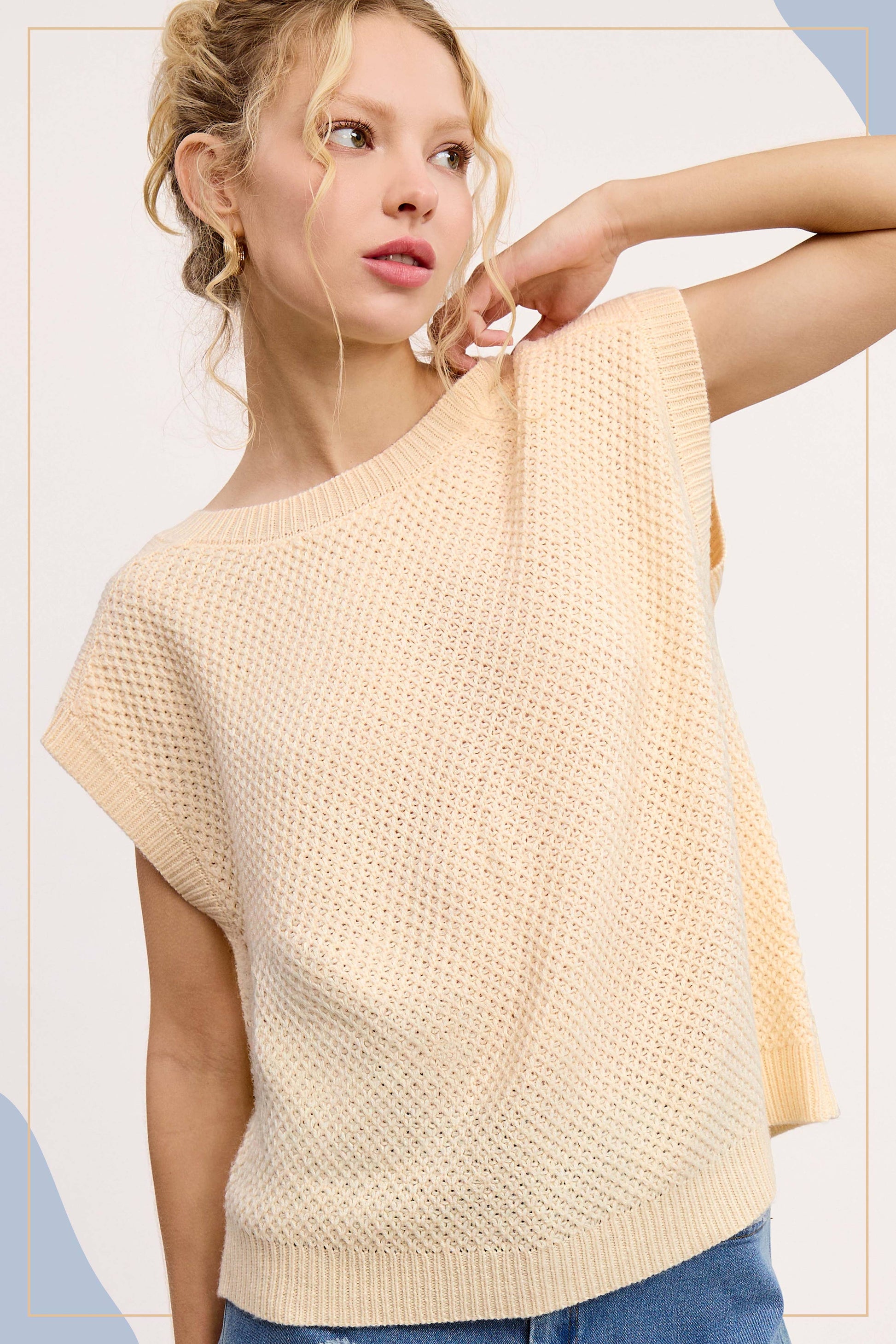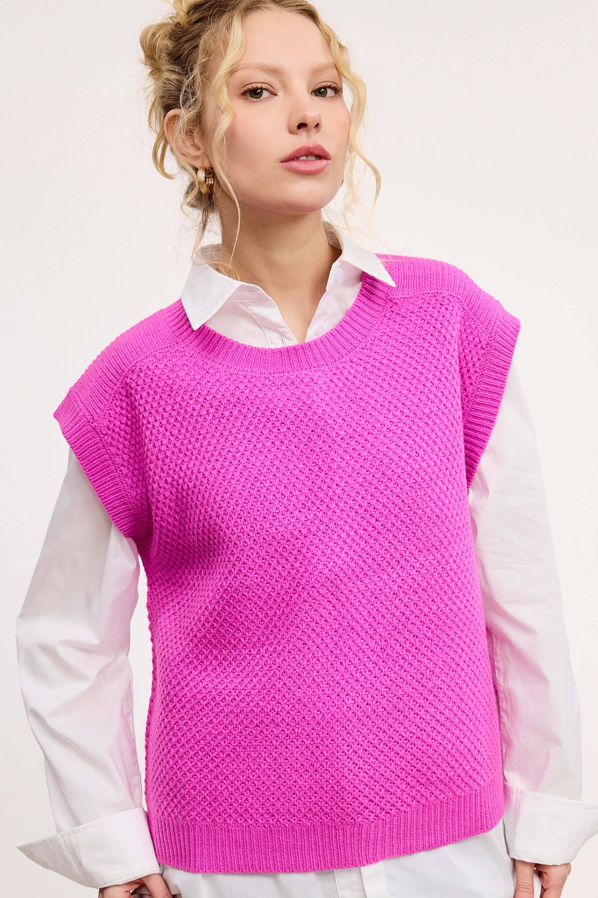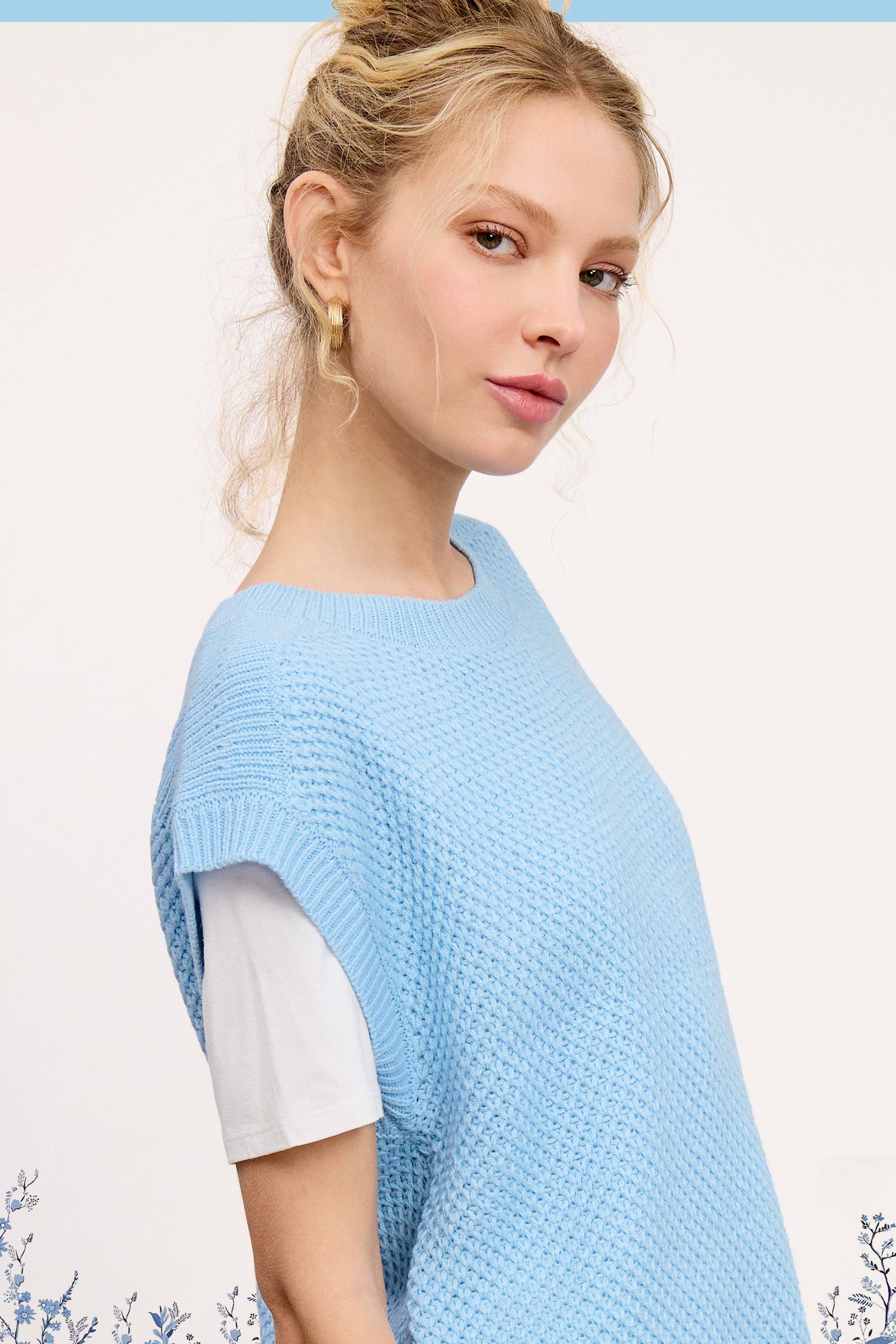 knit top, sweater vest, stylish top, layering piece, loose fit, soft fabrication, round neckline, basic top