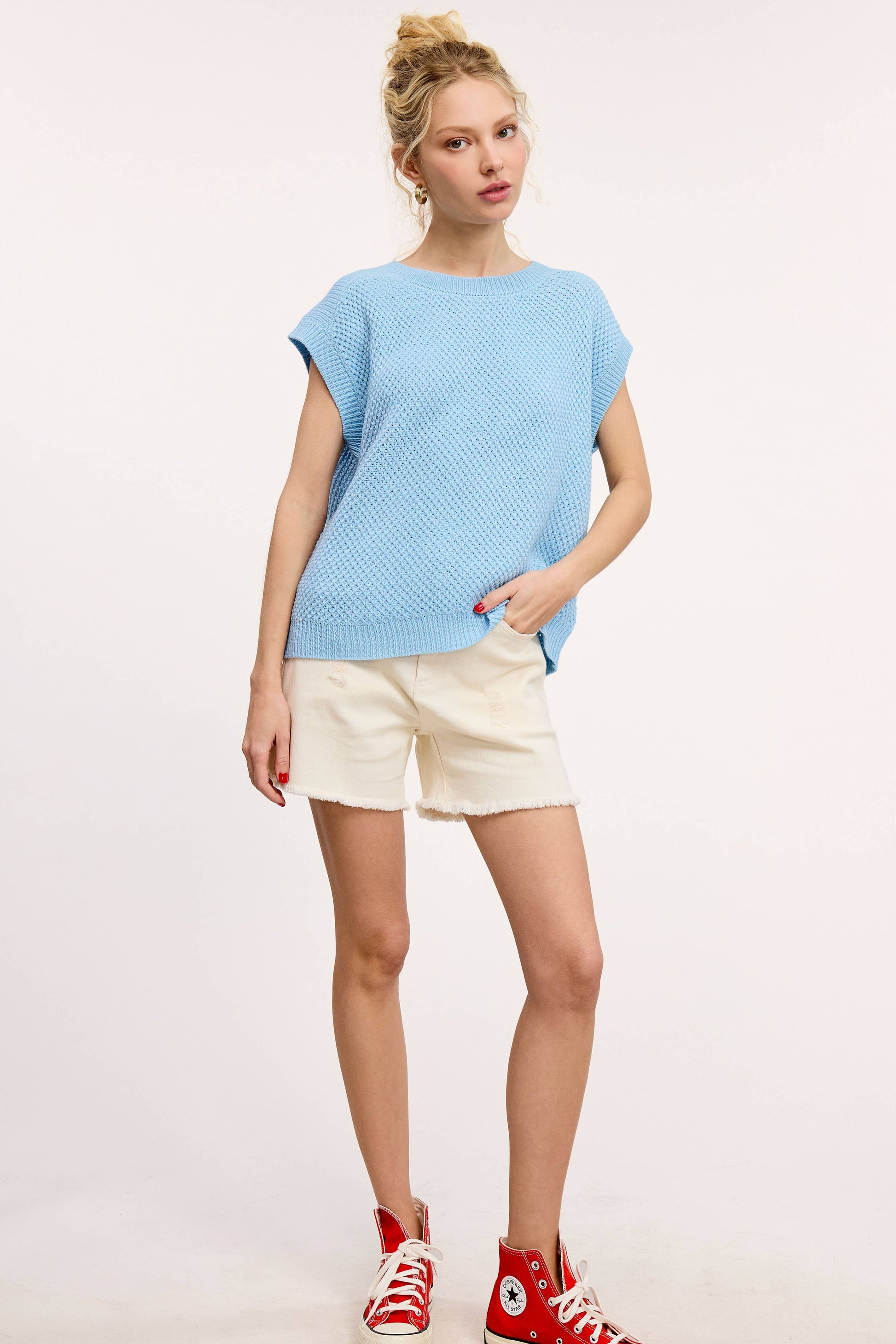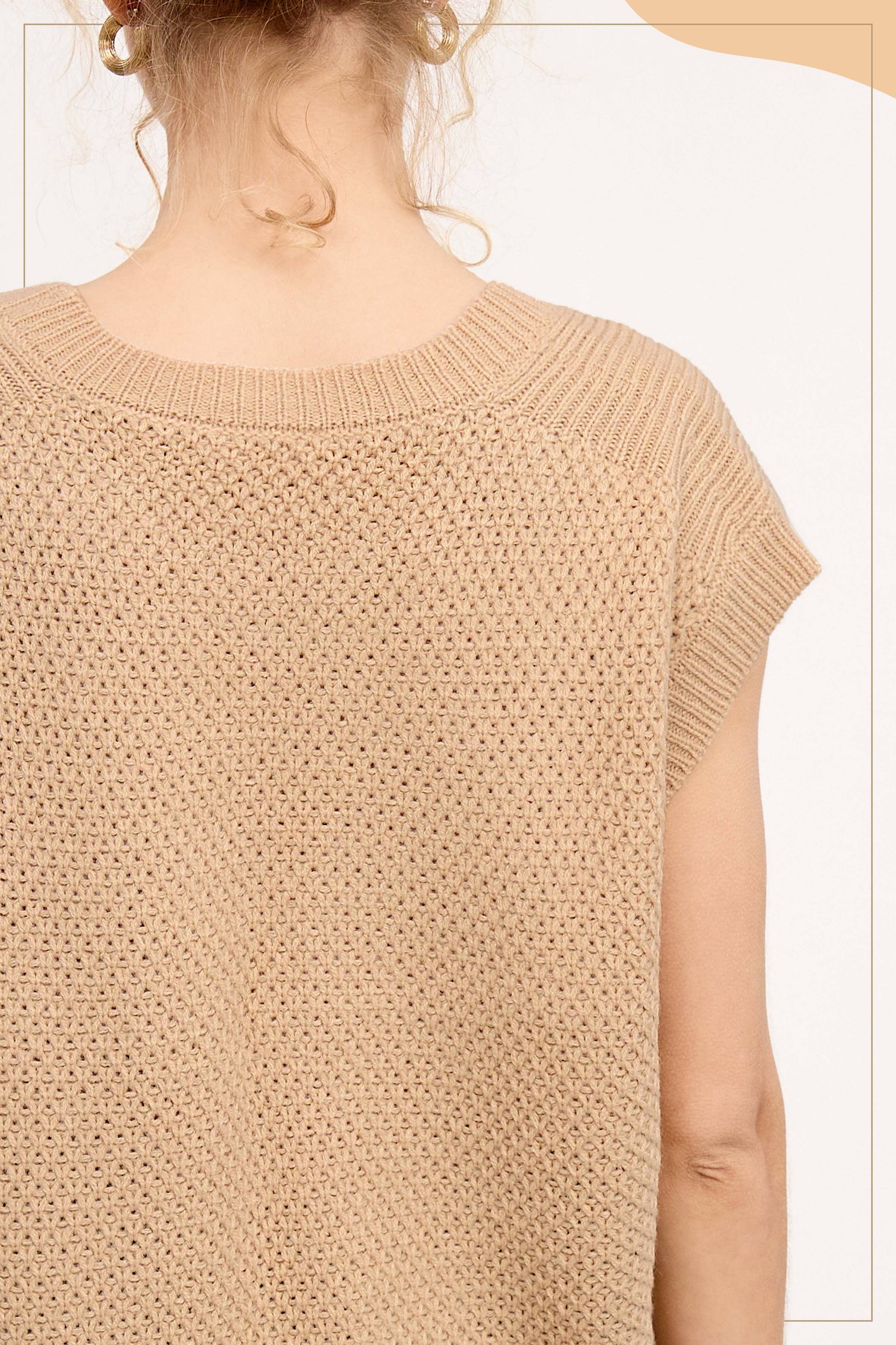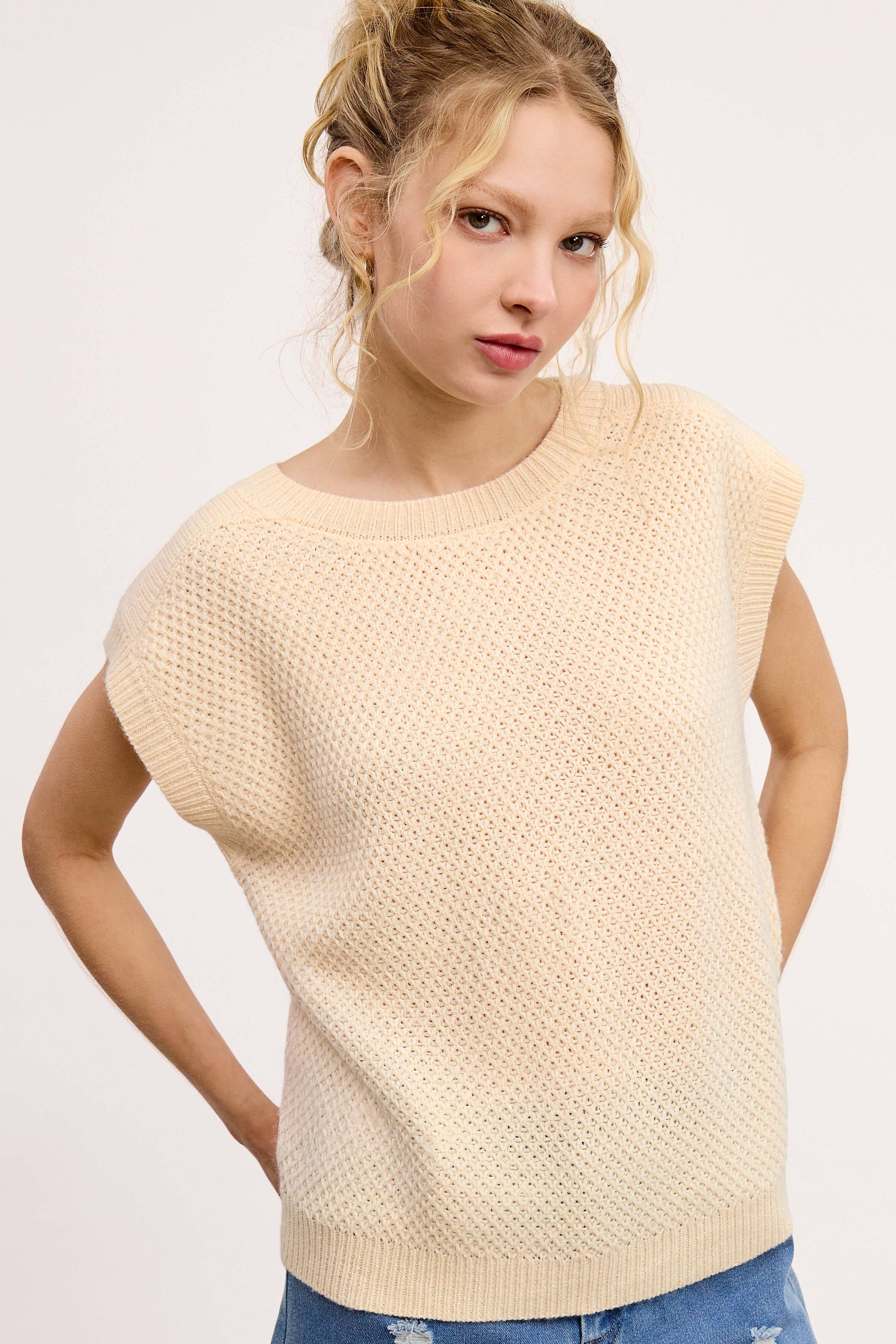 knit top, sweater vest, stylish top, layering piece, loose fit, soft fabrication, round neckline, basic top