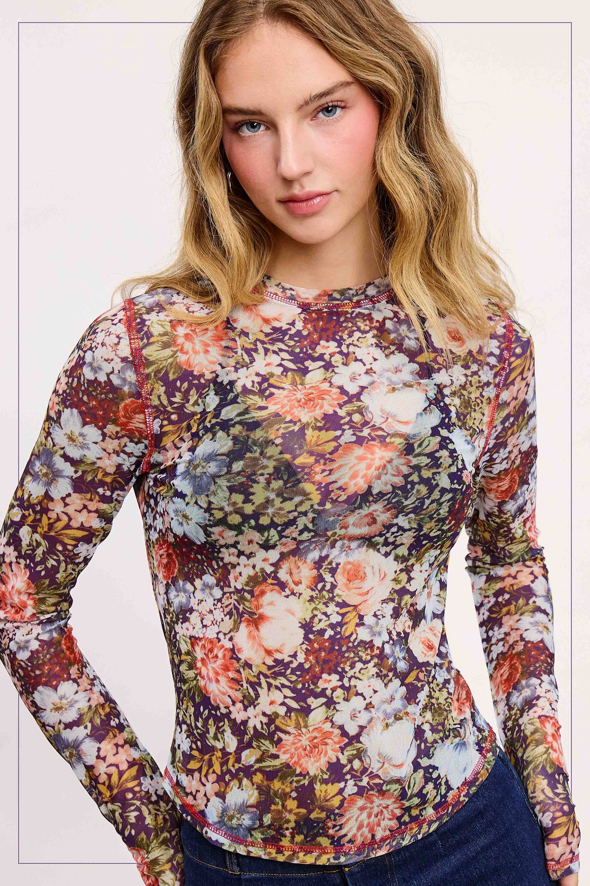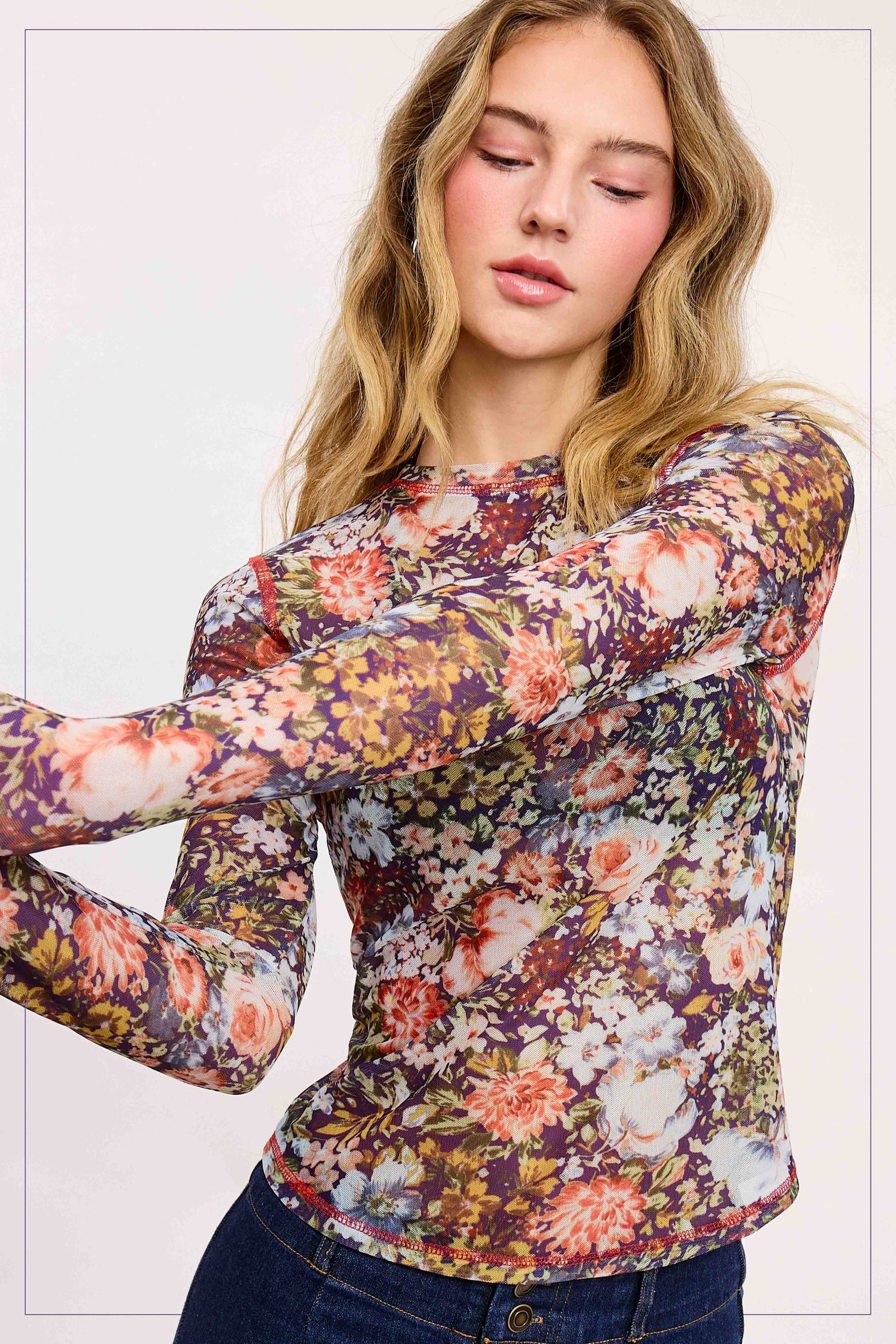 layering piece, long sleeve, crew neckline, floral pattern, unique top, semi sheer fabric, stretchy fabric, mesh top, fitted silhouette, exposed stitching, vintage style, feminine