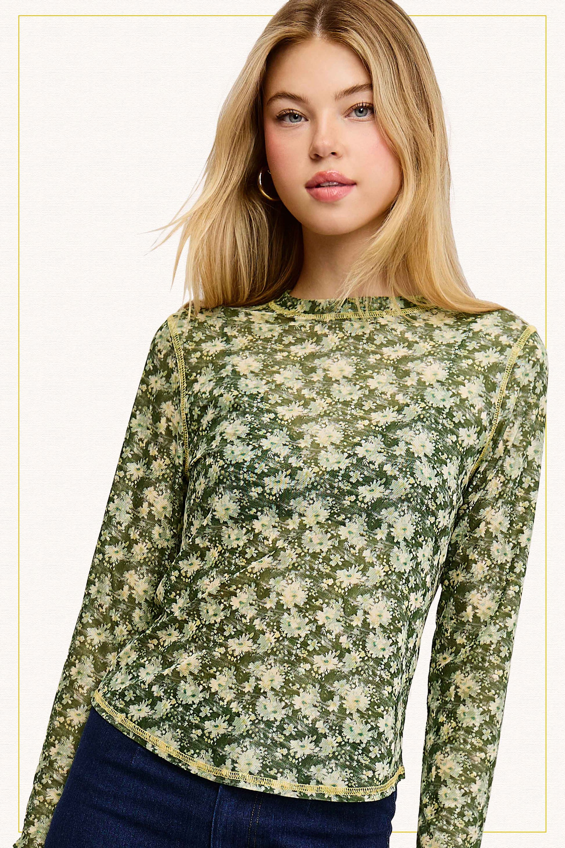 layering piece, long sleeve, crew neckline, floral pattern, unique top, semi sheer fabric, stretchy fabric, mesh top, fitted silhouette, exposed stitching, vintage style, feminine