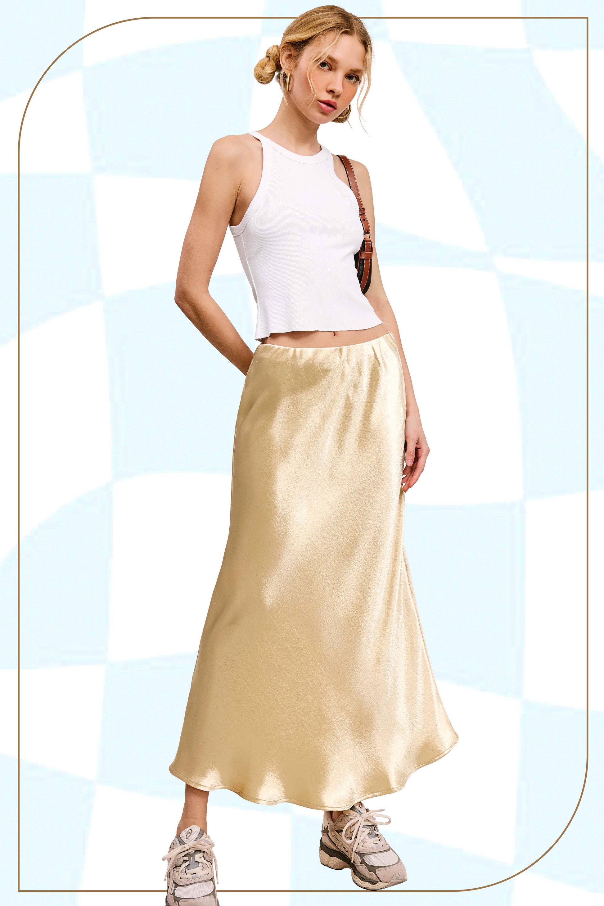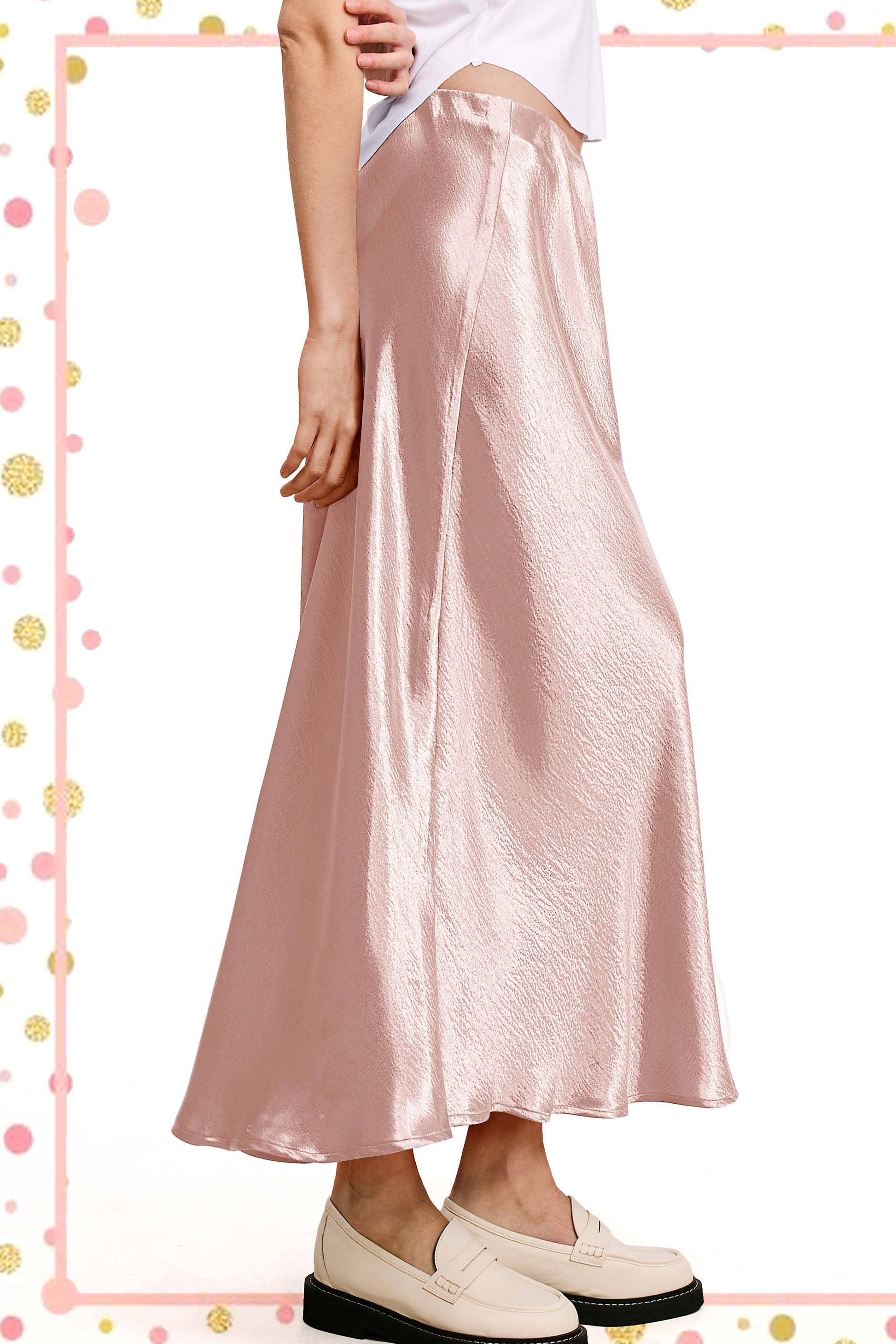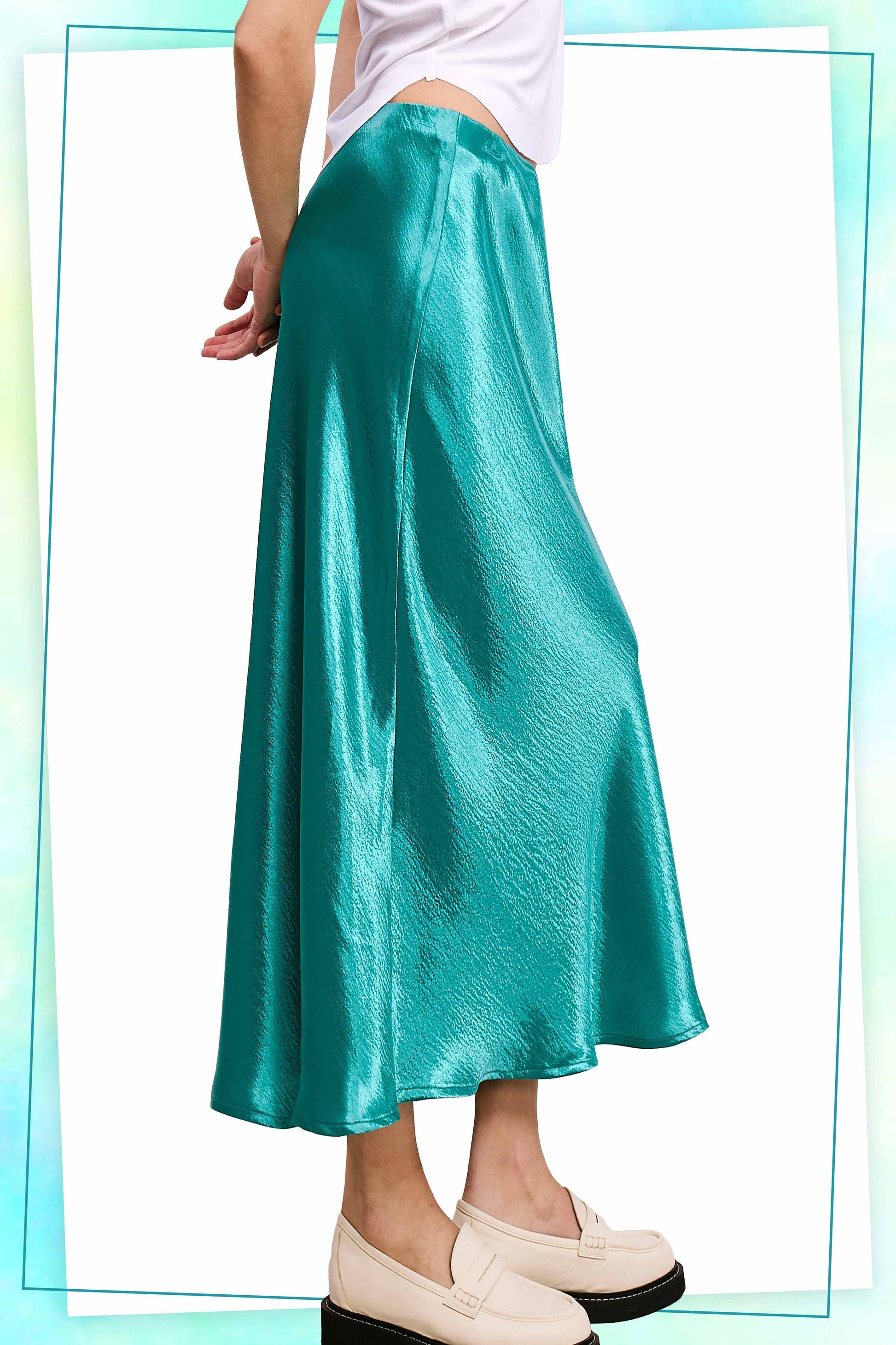 This satin long skirt, with its glossy, silky finish, reflects light beautifully. It has a fluid, draping silhouette that falls elegantly to a midi length, enhancing its chic and sophisticated appeal. The skirt features a smooth, elasticized waistband for a comfortable fit and a slightly flared hem for effortless movement. Its lustrous fabric adds a touch of glamour, making it perfect for both casual and dressy occasions.