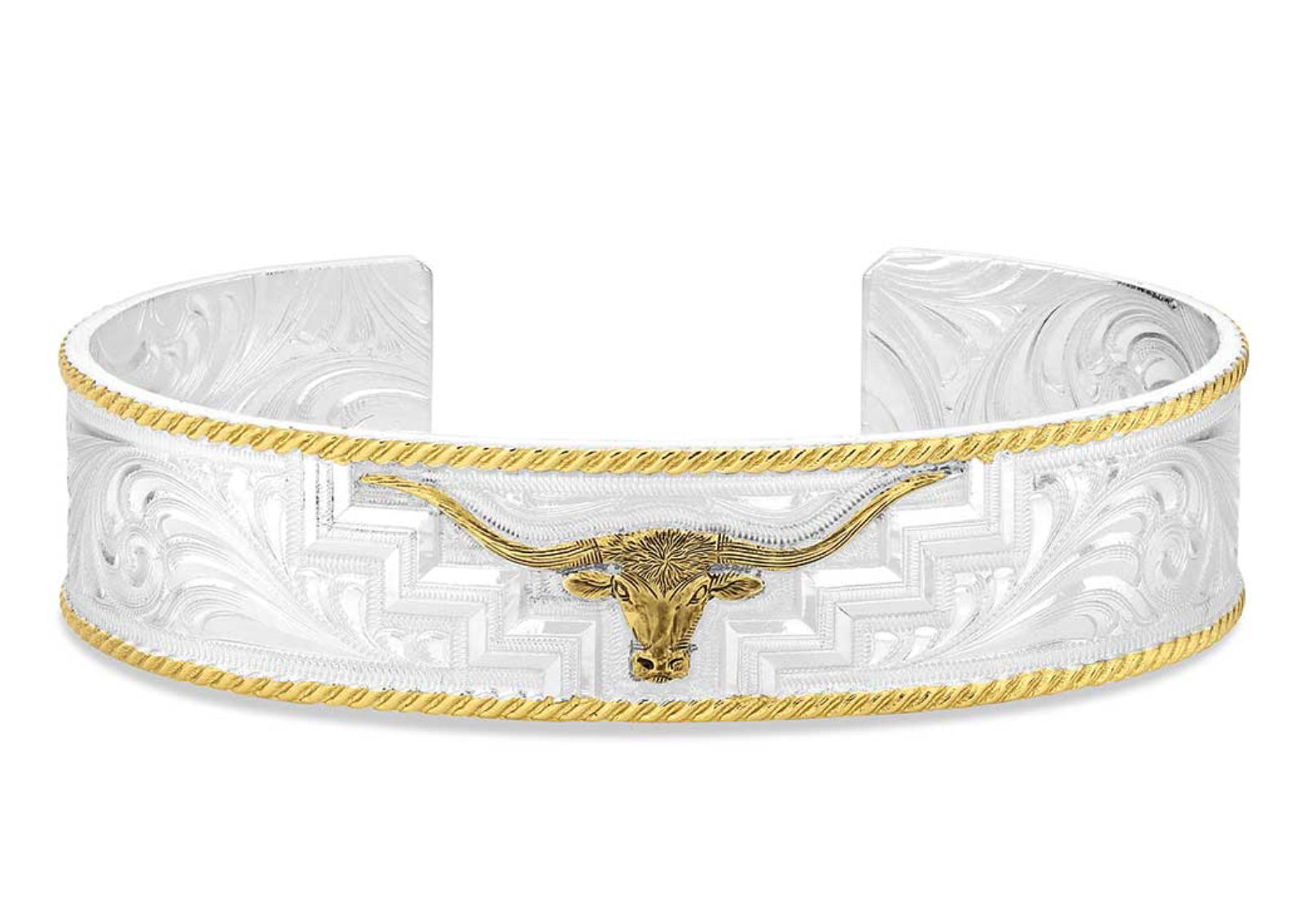 The simple style of the Longhorn Trails Bracelet makes it a piece that is easy to pair with anything! The silver tone cuff features bright cut engraving, and a gold finished twisted rope edge. At the top of the cuff is an antiqued longhorn in a gold finish to complete the design. One size fits most.