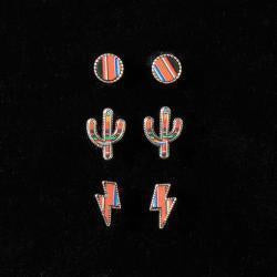 Beautiful Silver Strike earrings. 3 pairs of earrings with a multi colored serape design on each motif.