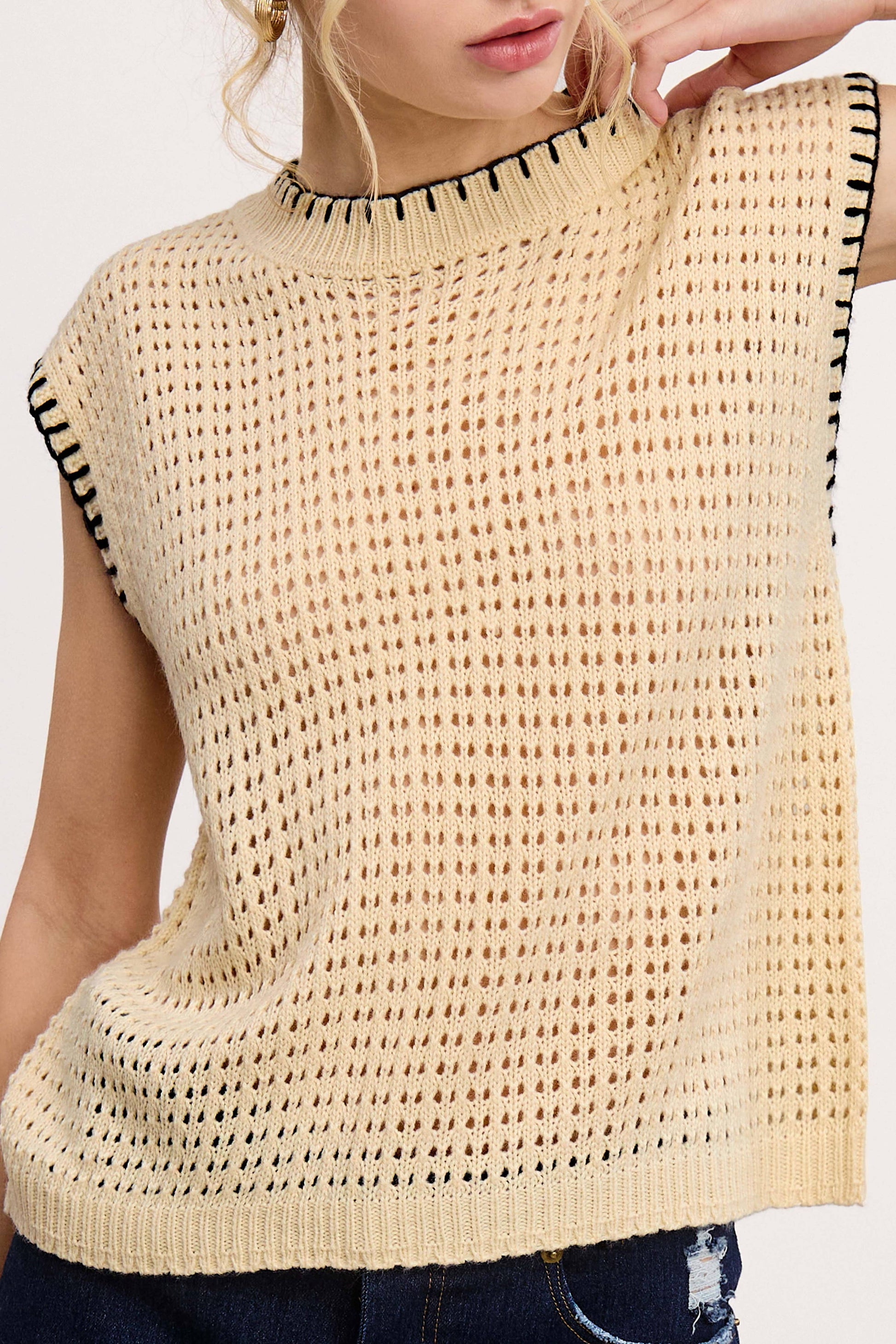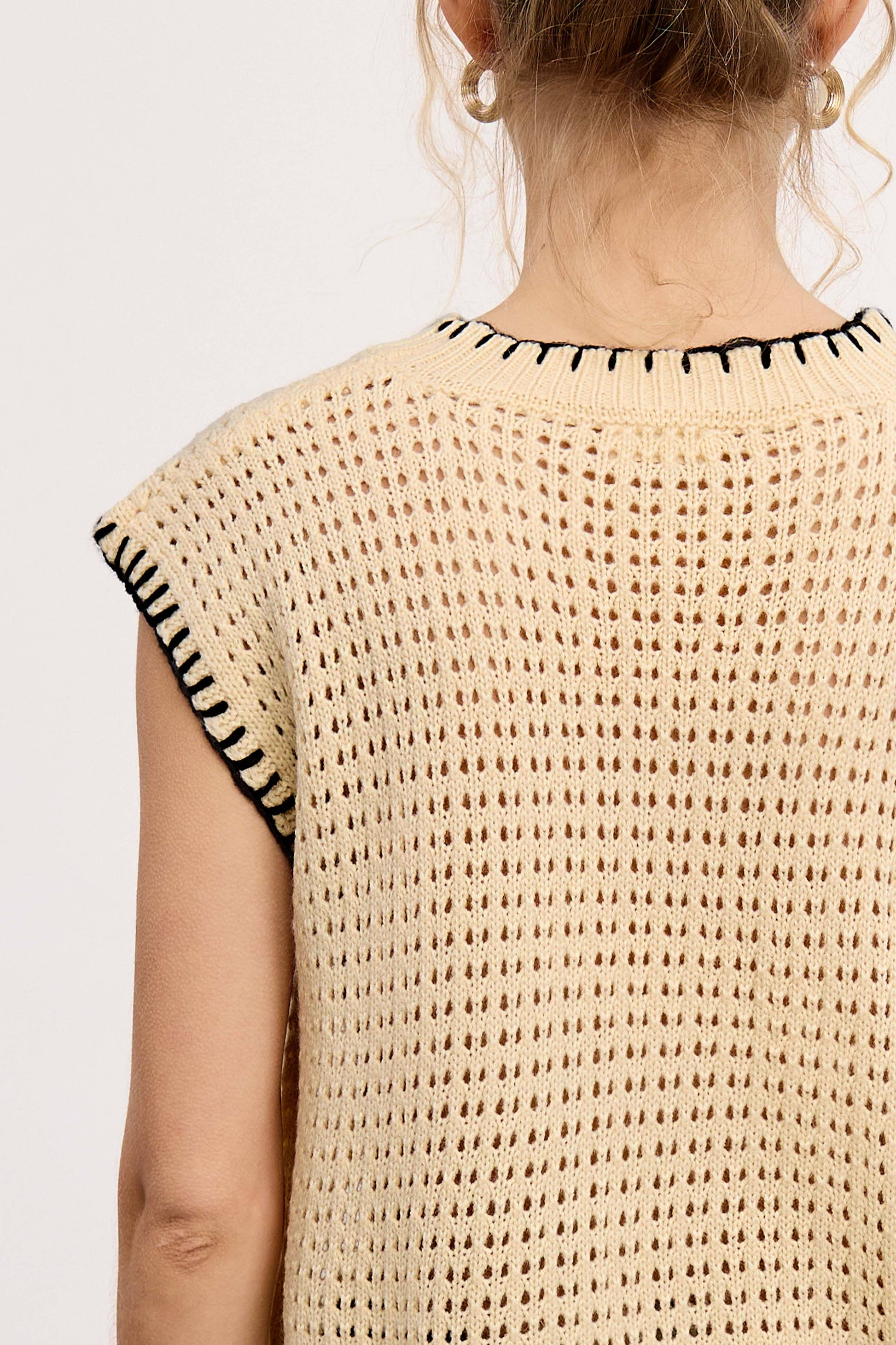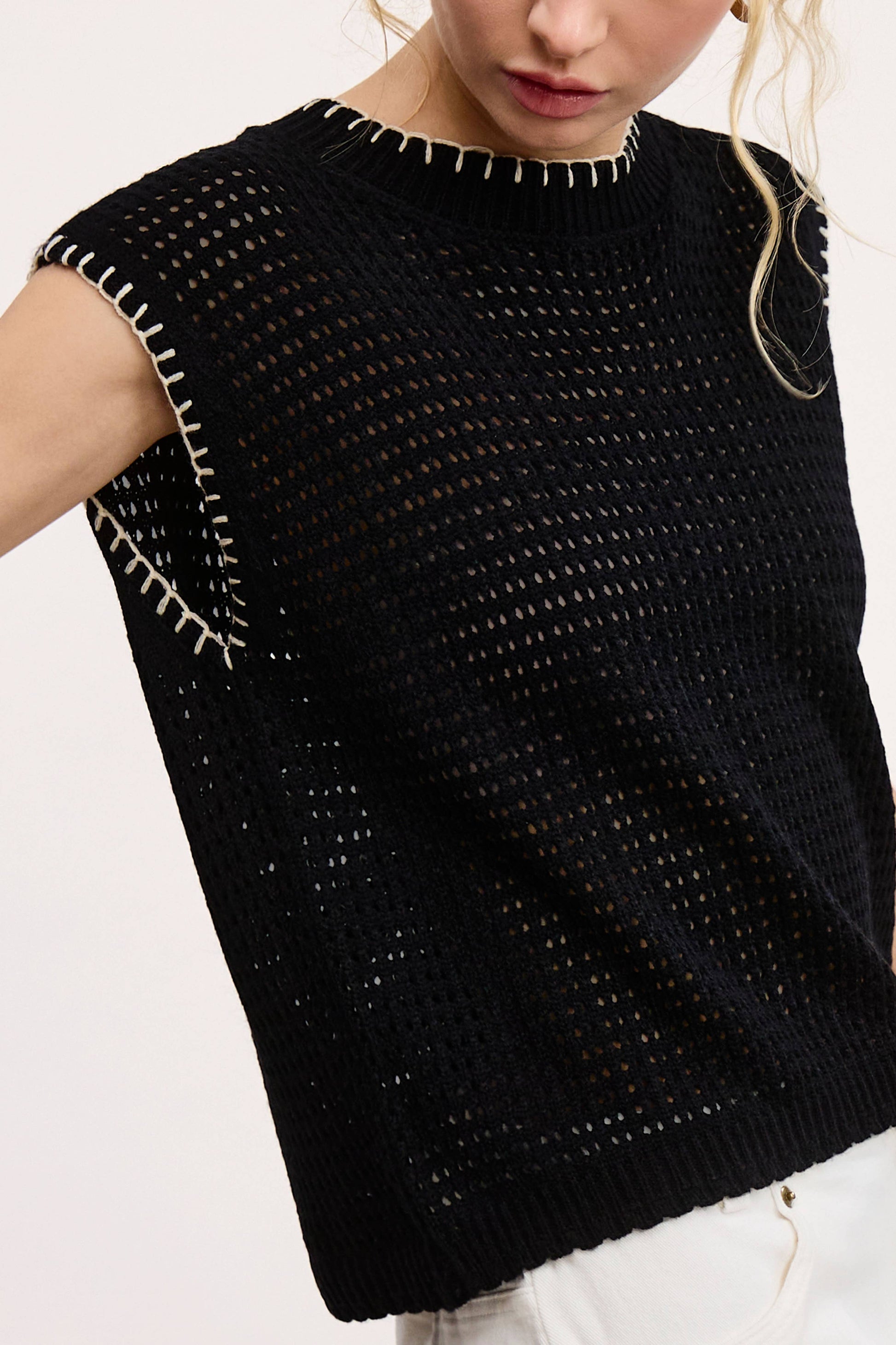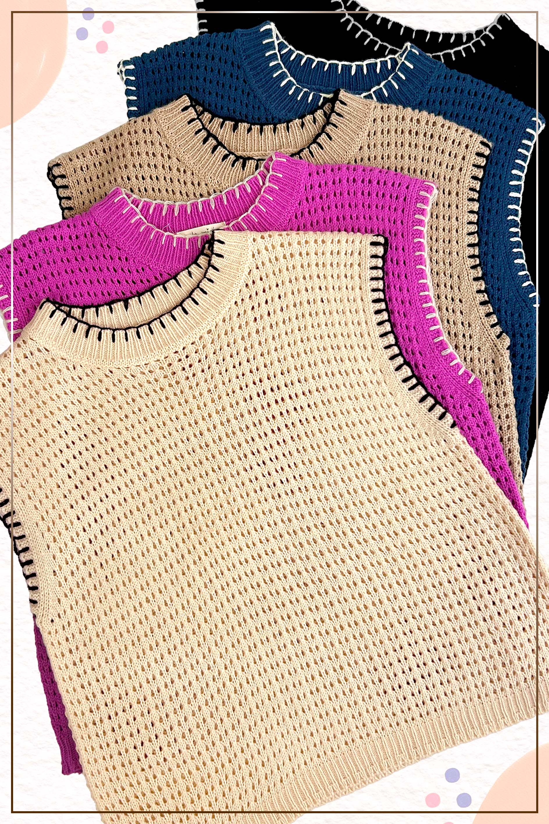 stitch detail, sleeveless top, knit vest, knit sweater top, layering piece, sweater vest, relaxed fit, crew neckline