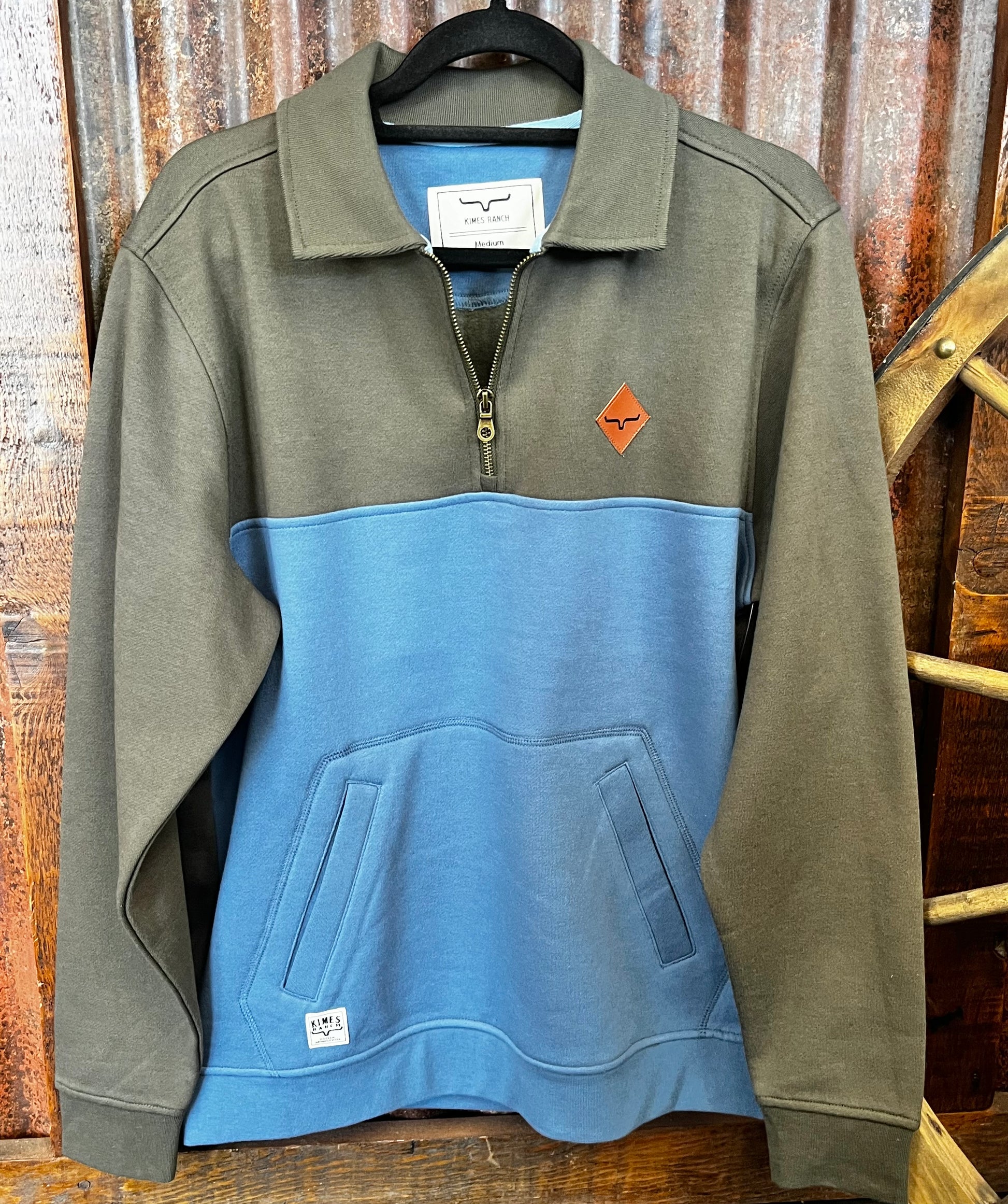 Details: Long Sleeve, Quarter Zip Opening With Fold-Over Collar, Contrasting Color Block Front Panel, Hidden Front Kangaroo Pocket, Diamond-Shaped Leather Longhorn Patch At Chest, Small Kimes Ranch Logo Patch At Pocket