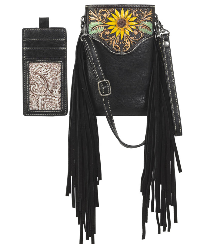 Nocona Norma cell phone crossbody by M&F Western Products. Black with sunflower tooled panel and ivory stitching. Adjustable, removable leather strap and wristlet and belt loops on the back. 2 compartments, 1 for cell phone storage and the other with a removable ID/credit card case.
