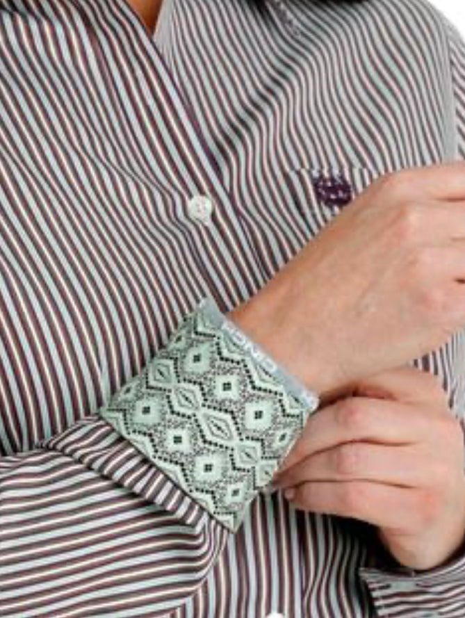 Women's Cinch Shirt: Ladies Cinch Western Shirt. Get your western on with this ladies striped shirt from Cinch. This long sleeve shirt has a single open chest pocket with a logo label on it. It closes with buttons and has printed contrast trim. Made with polyester, tencel and cotton twill weave