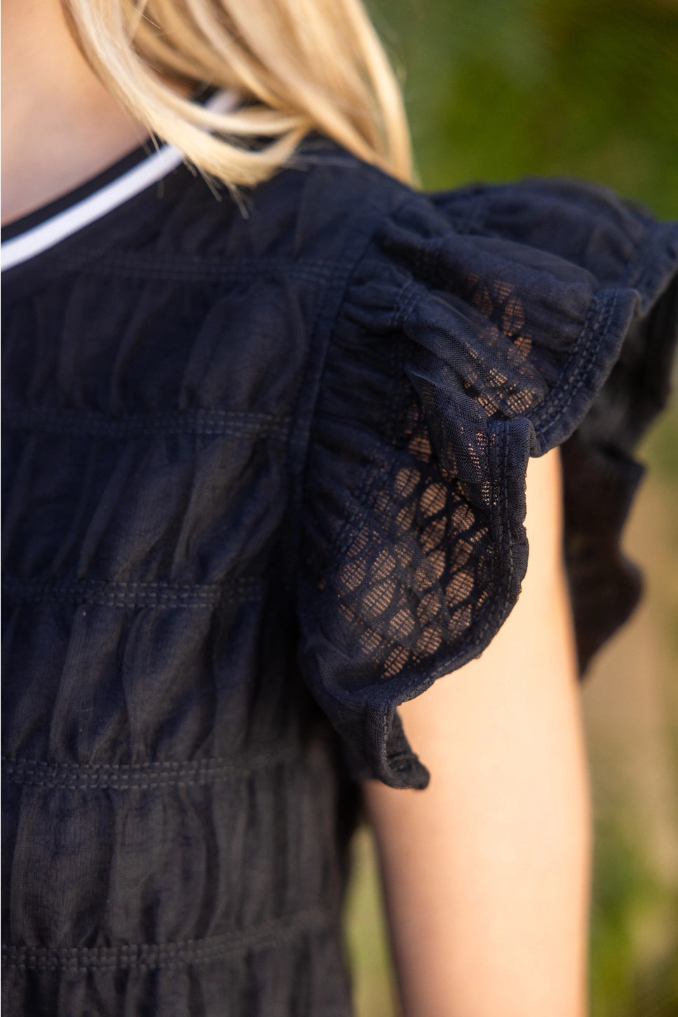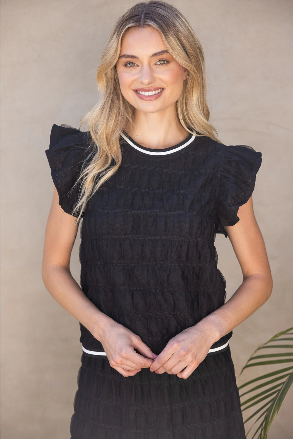 Round neckline • Ruffle short sleeves • Contrast striped elastic band • Tulle detailed textured knit fabric top • Size information: