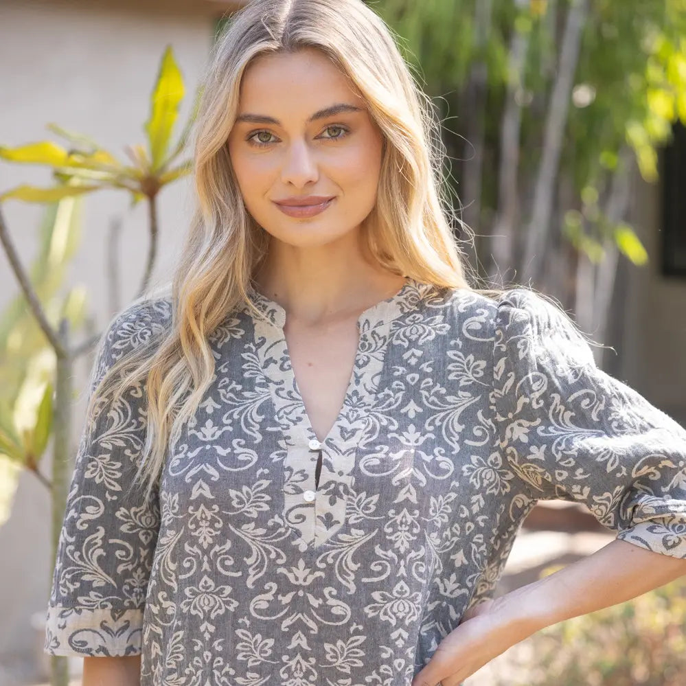 • V neckline with button-up detail • Negative contrast band details • Half length sleeves • Jacquard print woven fabric top • Size information: